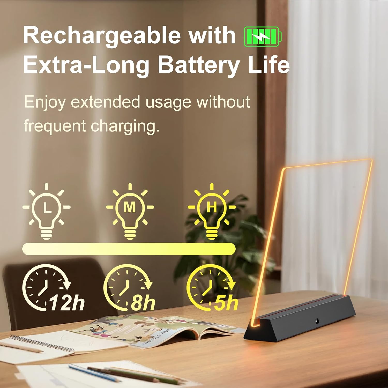 - Rechargeable & Long-Lasting: Features a built-in lithium polymer battery for true cordless freedom. Enjoy up to 12 hours of continuous illuminated use on a single charge—no outlets or disposable batteries needed.